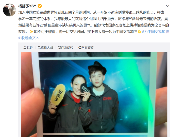 这一次,杨舒予也是参加了中国女篮的集训,经历了全过程,但是在最后一刻落选,无缘跟姐姐杨力维一起打今年的女篮世界杯。杨舒予看起来很失落,她在社媒账号上表示自己不缺从头再来的勇气,以后还是想继续为中国五人制女篮打国际比赛。