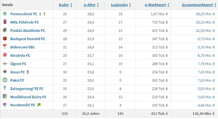 图:匈牙利甲级联赛球队概况,数据来源:德国转会市场