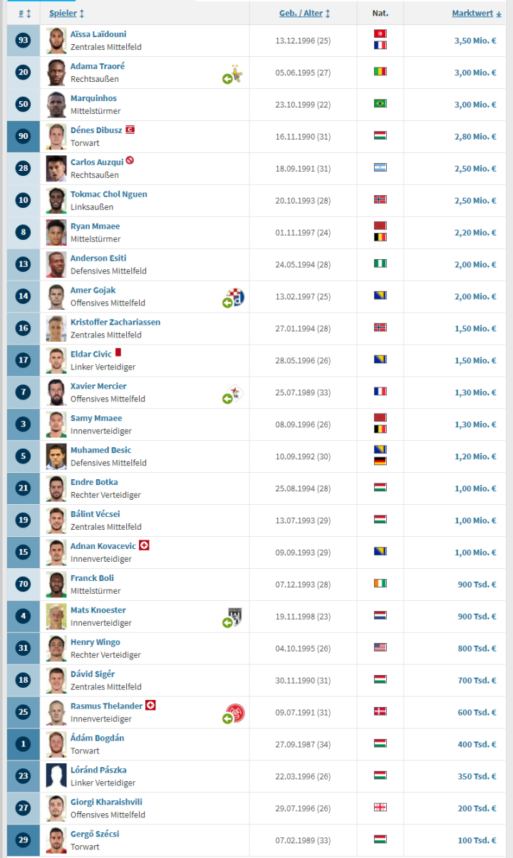 图:本赛季费伦茨瓦罗斯的注册球员,数据来源:德国转会市场
