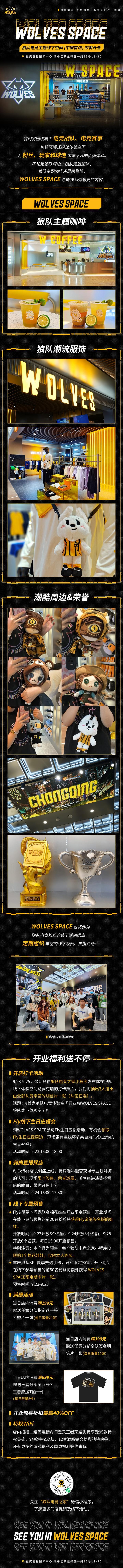 WOLVES SPACE狼队电竞主题线下空间国内...英格兰狼队足球俱乐部 @懂球帝2022-09-22 14:09WOLVES SPACE狼队电竞主题线下空间国内首店即将在9.24于重庆正式开业! 我们将围绕旗下电竞战队、电竞赛事构建沉浸式粉丝体验空间,为粉丝、玩家、球迷带来不凡的线下体验。 不论是狼队周边、狼队潮流服饰、狼队主题咖啡还是荣誉墙,欢迎前来WOLVES SPACE打卡,了解狼队的一切。展开更多