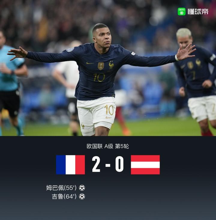 法国2-0奥地利,姆巴佩破门+失单刀,格列兹曼助吉鲁头槌建功