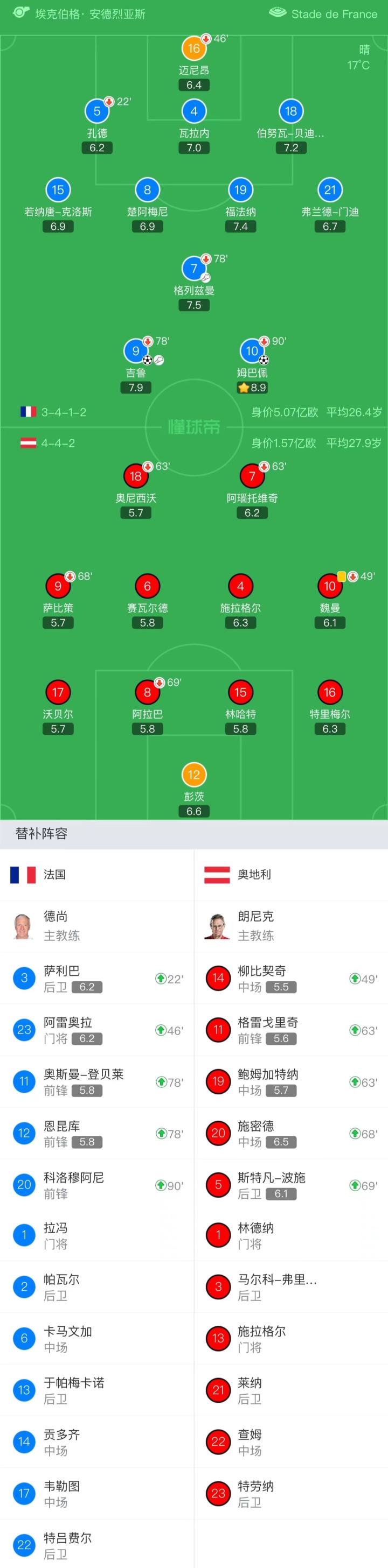 法国首发:16-迈尼昂(46'23-阿雷奥拉)、4-瓦拉内、5-孔德(22'3-萨利巴)、7-格列兹曼(78'11-登贝莱)、8-楚阿梅尼、9-吉鲁(78'12-恩昆库)、10-姆巴佩(90'20-科洛穆阿尼)、15-若纳唐-克洛斯、18-贝迪亚沙尔、19-福法纳、21-弗兰德-门迪