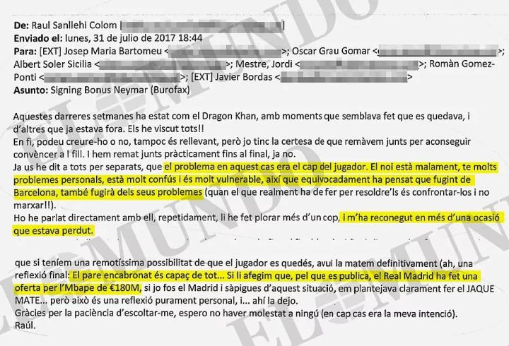 谈判的负责人之一是当时巴萨的足球总监劳尔-桑莱希。7月31日,就在内马尔最终与巴黎签署新合同的前三天,这位高管向俱乐部主席巴托梅乌和首席执行官奥斯卡-格劳以及其他高管发送了一封冗长的电子邮件,其中非常详细地叙述了他与经常被称为“Ney Pai”的内马尔的父亲手拉着手进行的谈话。