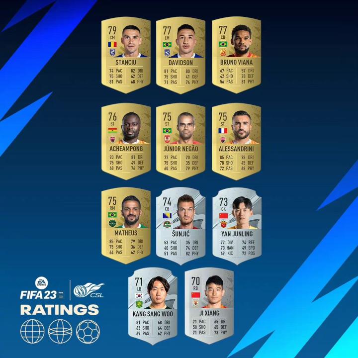 FIFA23中超球员能力值TOP11:斯坦丘79居首,颜骏凌73