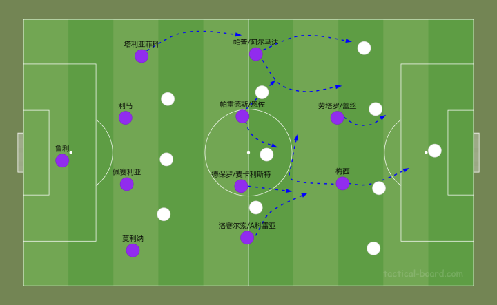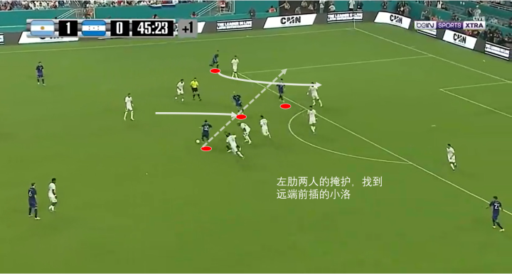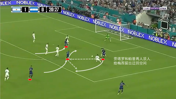 梅西撤回到中场后,德保罗这次出现在了肋部位置进行掩护,同时锋线上还有劳塔罗。