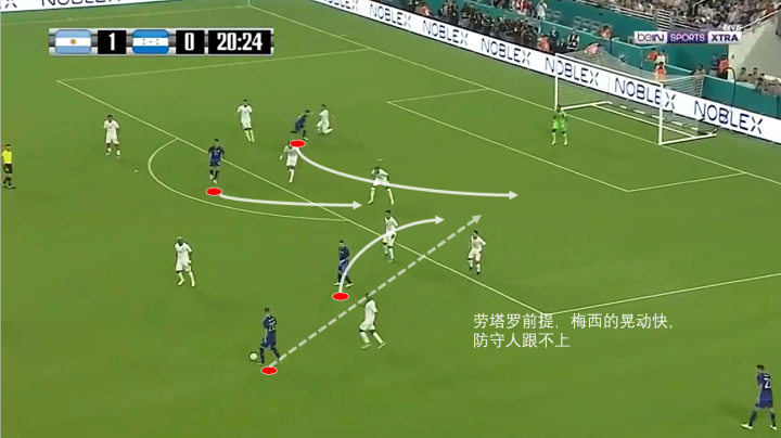 在梅西拿球前,塔利亚菲科的前插很关键,他顶上锋线和劳塔罗两人压制后卫线之后,梅西得球时戈麦斯获得前插机会。与梅西完成传跑配合,制造了之后劳塔罗的进球。
