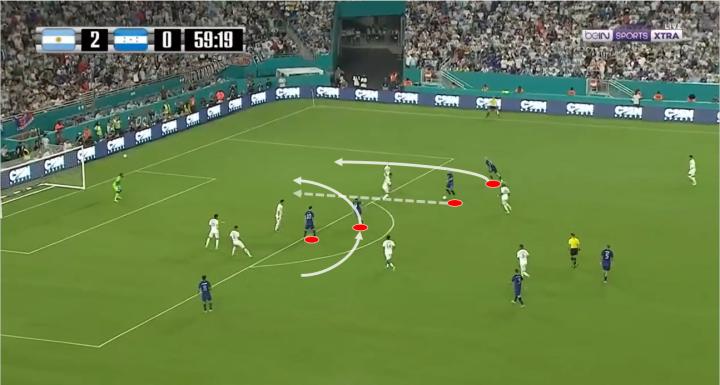 阿根廷在局部创造出巨大的人数优势,随后梅西直塞小洛。小洛在对方身后内收前插,对方后卫的注意力全部被德保罗吸引。随后只能犯规,送出点球。梅西主罚,点射命中。