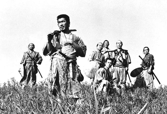 日本战国时代,一小山村面临着山贼的威胁,为了保护秋天的收成,村中长老决定让去请武士来保护村子安全,但只能拿出的报酬是一天三顿的白米饭。在城里,他们遭到了武士白眼甚至被打。直到勘兵卫(志村乔饰)的出现,他现今已沦为浪人,几经考虑最后答应了。他对农民说至少需要七名武士,于是久藏(宫口精二饰)、胜四郎(木村功饰)、五郎(稻叶义男饰)、七郎(加东大介饰)、平八(千秋实饰)和菊千代(三船敏郎饰)等六人也加入了队伍,七个人肩负保卫村子的任务。