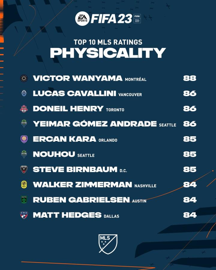 (FIFA23中,万亚马在MLS中综合身体评分排名第一)