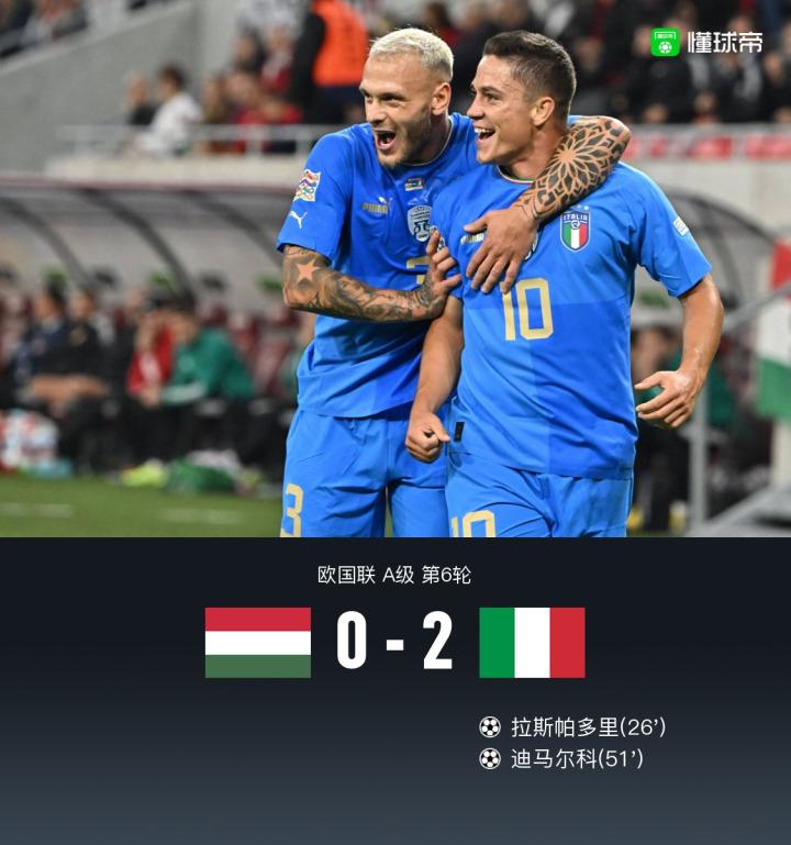 北京时间 9月27日2:45,欧国联A级C组第6轮,意大利客场挑战匈牙利,本场比赛主裁判是巴斯蒂安-伯努瓦。上半场,迪洛伦佐头球攻门偏出,拉斯帕多里推射破门,他是继莫伊塞-基恩后,第二名连场建功的意大利00后国脚。下半场,多纳鲁马多次救险,迪马尔科包抄破门收获国家队首球,最终,意大利2-0匈牙利。