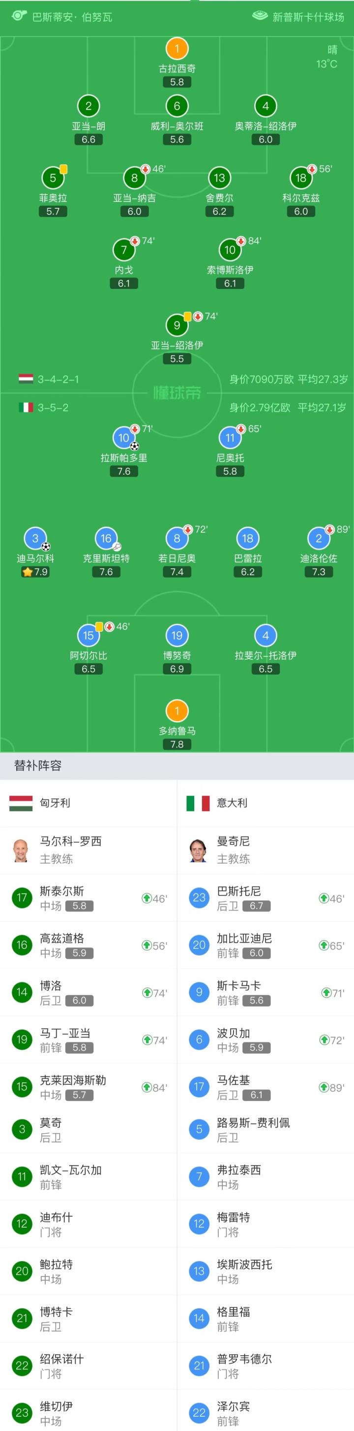 意大利首发:1-多纳鲁马、2-迪洛伦佐(89'17-马佐基)、19-博努奇、15-阿切尔比(46'23-巴斯托尼)、4-托洛伊、16-克里斯坦特、8-若日尼奥(72'6-波贝加)、3-迪马尔科、10-拉斯帕多里(71'9-斯卡马卡)、11-尼奥托(65'20-加比亚迪尼)、18-巴雷拉