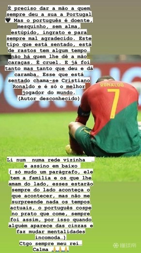 “我在网上看到了这段话,我只是修改了其中的一小部分,他身边有他的家人和爱他的人,无论究竟发生了什么,那些人都将永远在他身边。但我对现在的这个时代一点也不感到惊讶,葡萄牙人会在他们吃过的菜里吐口水,一直都是这样的,这就是为什么当有人想要扭转不利的局面时会感到这么困难。我们永远与你同在,我的国王。平静下来吧。”