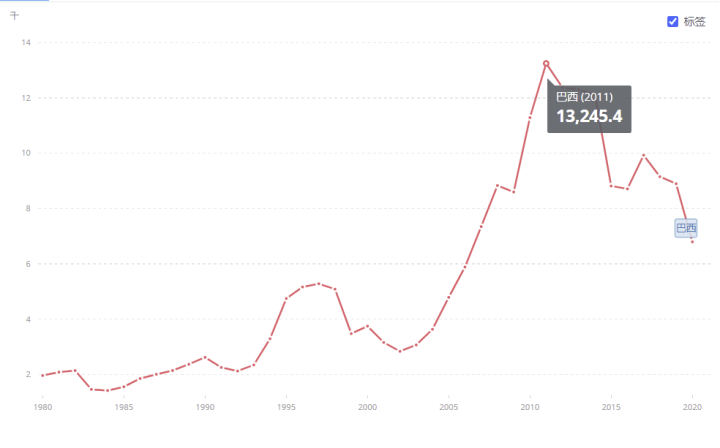 然而,自2010年以后,巴西经济增长遇冷,2012年几乎陷入停滞。人均GDP自2011年以后不停下降。