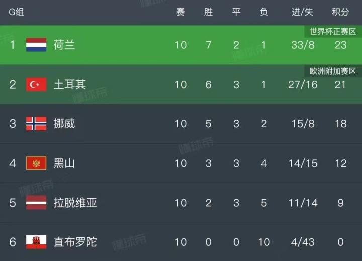 世界杯欧洲区预选赛,荷兰与土耳其、挪威、黑山、拉脱维亚以及直布罗陀同组。10场比赛战罢,荷兰取得7胜2平1负的成绩排名榜首直接晋级世界杯正赛。