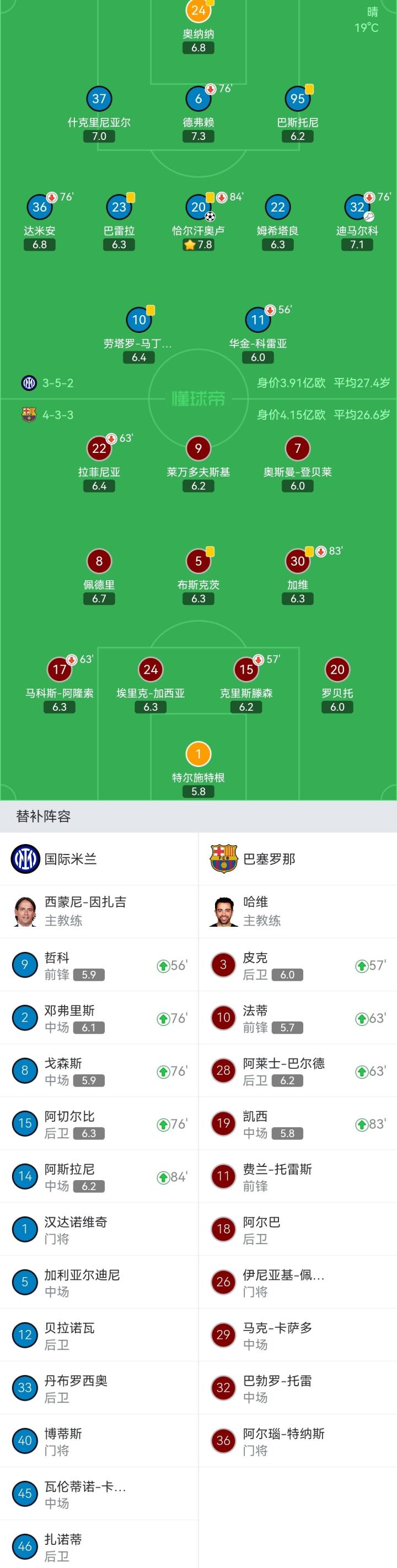 国际米兰首发:24-奥纳纳、95-巴斯托尼、6-德弗赖(76'15-阿切尔比)、37-什克里尼亚尔、32-迪马尔科(76'2-邓弗里斯)、36-达米安(76'8-戈森斯)、23-巴雷拉、20-恰尔汗奥卢(84'14-阿斯拉尼)、22-姆希塔良、11-华金-科雷亚(56'9-哲科)、10-劳塔罗-马丁内斯