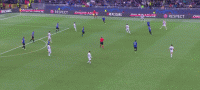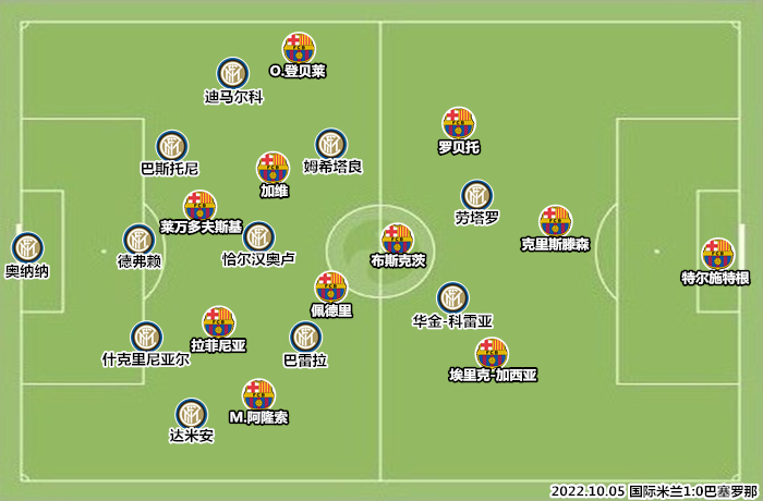 边卫持球进攻能力下滑,哈维调整了两名边锋的站位(较之对阵拜仁时),奥斯曼-登贝莱从右路出发寻找传中机会,为两名“中锋”输送炮弹。或许是忌惮国米中场推动反击的能力,或许是认为简单的边路传中就能解决问题,巴萨没有围绕奥斯曼-登贝莱打出复杂的配合,后者被国米的人海战术所淹没。