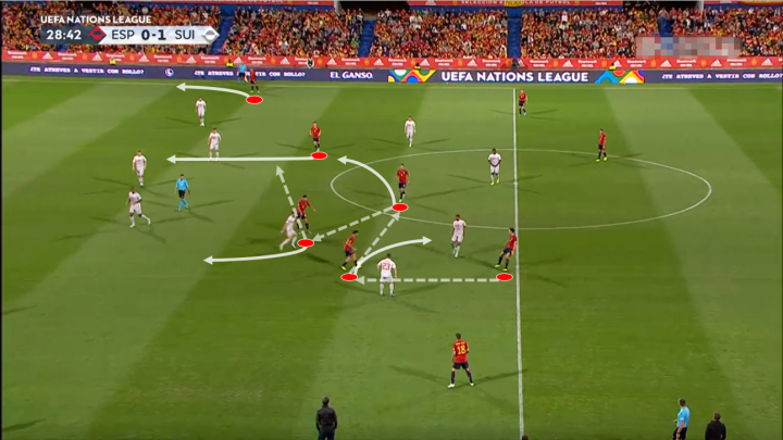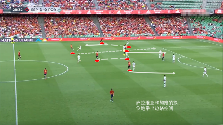 来看这波保托雷斯带球传给佩德里后,阿森西奥的回撤,布斯克茨横移接应,西班牙在中圈附近瞬间创造出四人的人数优势,同时远端还有空位的加维以及拉边的费兰·托雷斯。