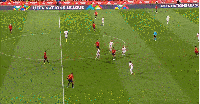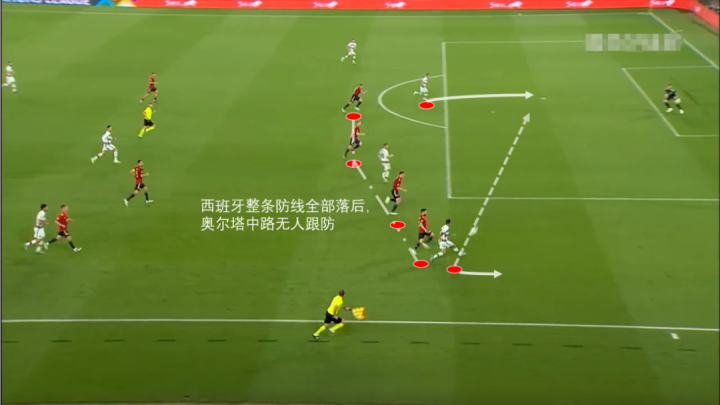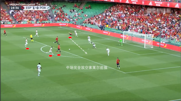 在加维压缩了葡萄牙的防线后,中路的莫拉塔和索莱尔两人跟进,中场完全放空了放空了索莱尔。后卫线退的过于靠后,两线之间的空档太大了。