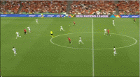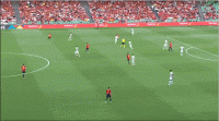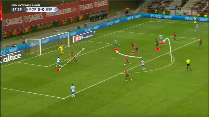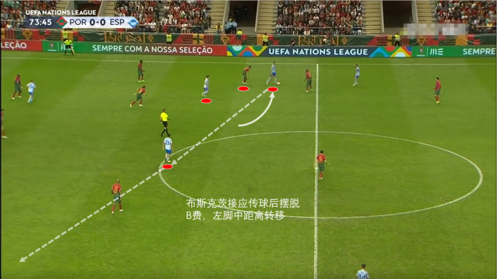 再看这次,这次进攻极其接近进球,又是打在了葡萄牙的中场退防不到位的软肋上。葡萄牙本场先发的三名中场的覆盖能力在西班牙中路足够兵力的情况下显得捉襟见肘。