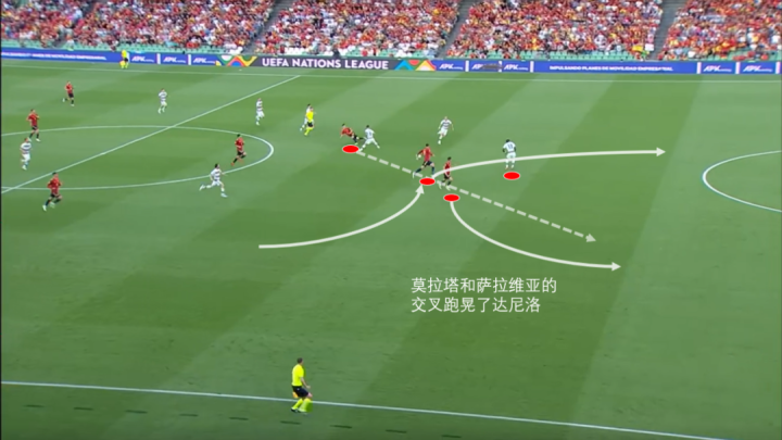 再看这次对阵葡萄牙的绝杀,莫拉塔的移动非常聪明,他也再一次证明自己是西班牙锋线的关键一环。在布斯克茨完成转移后,莫拉塔回撤等防线被右侧进攻吸引后再顶回锋线,寻找和鲁本·迪亚斯一对一的机会。随后在队友送出传中后,莫拉塔很快地钻迪亚斯的身后获得空位。