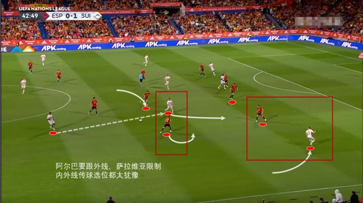 根本就在于瑞士后场直塞时,佩德里还没到位,萨拉维亚的防守选位很迷。在内线和外线的传球线路封堵之间犹豫不决,最终根本没有形成任何有效的防守选择。而边后卫阿尔巴身侧有瑞士队前插的边后卫,阿尔巴被牵制着,没办法内收去限制沙奇里的突进。