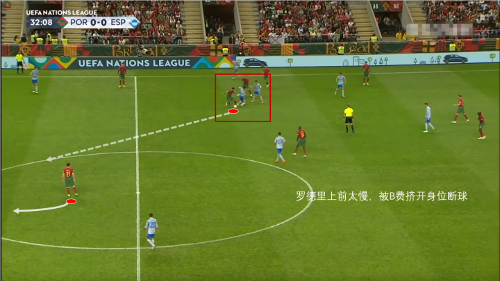 先看这次罗德里作为后腰,上前接应边路的队友太过犹豫,反倒是导致自己对抗中输给了B费,被对方打出一次极具威胁的反击,好在最后若塔的打门被门将扑出。
