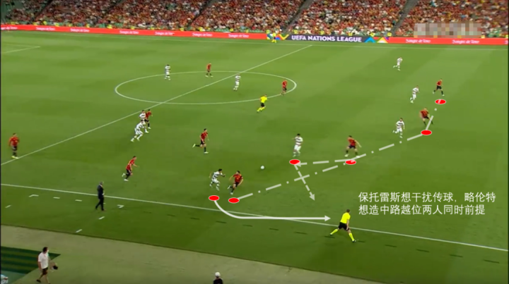 阿尔巴被打二过一时,没跟上坎塞洛,但是左中卫的保托雷斯这下前顶意义其实不大。因为距离有点远,没办法干扰对方传球,况且自己身后还有人,丢掉位置前顶的选择并不明智。然后略伦特,看到了保托雷斯突然地前顶,又发现了自己身前的进攻球员。