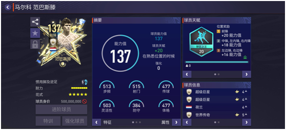 荷兰巨星范巴斯滕身高1.88米,体重80千克,是游戏中极具代表性的锋线大模型球员。一直以来,他都是游戏各种段位玩家最爱的一张锋线。游戏中,范巴斯滕最近推出的一张代表性球员卡就是这张赛季之星,天赋方面范巴斯滕配备了禁区之王,这项天赋不仅加成了他的射门相关数据,提升了他的得分效率,而且还对他的盘带数据有所提升,让范巴斯滕持球进攻能力得到增强。实战中,范巴斯滕的得分相当犀利,远射、头球无所不能,而且他的跑位非常出色,禁区内的机会创造能力非常强。盘带方面,范巴斯滕的花式衔接流畅,盘带时遇到贴身防守也能保持稳定的控制。他既能作为一个前场的门前终结者,也能作为一个持球推进点。