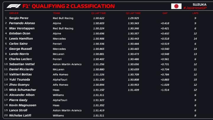 Q2停表,在赛道上的车手均进入到了第二个飞行圈。佩雷兹率先刷出1分29秒925的成绩,来到第一。阿隆索来到第二,维斯塔潘第三。不得不感叹,铃鹿赛道排位赛各车手的成绩差距确实很小,里卡多距离关门线只有0.003秒。周冠宇距离关门线也只有不到0.3秒。