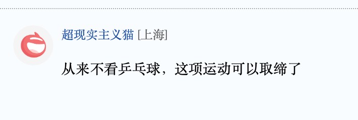 这里就要说到我的另一个暴论了:国乒输球后谩骂的人,和国足输球后在微博抖音乱喷的“球迷”其实没什么两样。他们平时并不关心乒乓球/足球,只是在奥运世锦赛/世预赛亚洲杯到来的时候,因为他们是国家队而有了评论的欲望。想想你有多讨厌那些对自己主队指指点点的网友,下次吐槽乒乓球队的时候可能会稍微不那么刻薄吧?