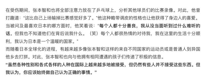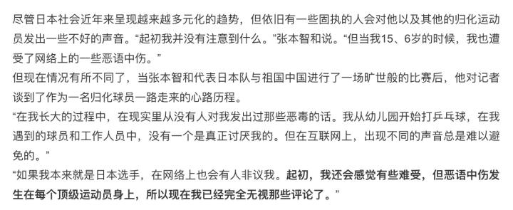 最后,以张本智和在世乒赛“空砍”两分以后的采访作为结束吧,希望大家能够看一看,这位被抹黑嘲讽对手,打上叛徒、狂妄标签的19岁年轻人,在面对网络暴力时是如何与自己和解的。乒乓球和足球都是充满魅力的运动,希望我们都能享受竞技体育带来的魅力。