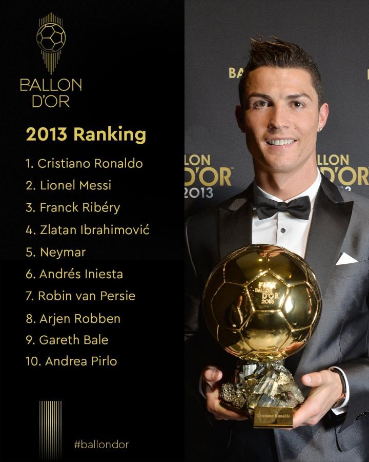 2022年金球奖颁奖典礼将于10月17日举行,今日金球奖官方回顾了2013年金球奖排名,C罗第二次获奖,梅西第二,里贝里第三。