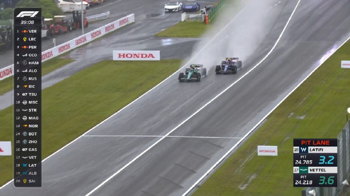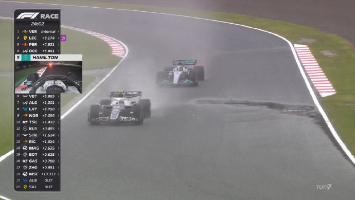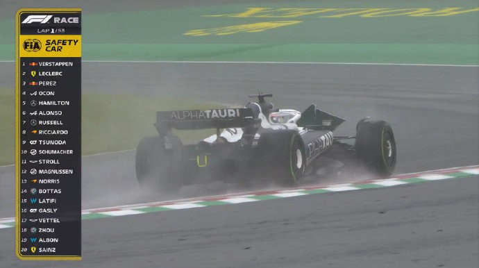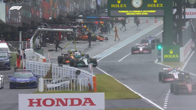 五盏红灯熄灭!2022F1大奖赛日本站正赛正式开始!维斯塔潘起步稍有问题,但好在成功守住第一!佩雷兹超越了塞恩斯来到第3位。起步太混乱了,塞恩斯撞车了!赛会释放安全车!加斯利一度顶着广告牌在跑,阿尔本也停在了场边。这仅仅是起步啊!从回放来看,维特尔阿隆索发生了碰撞,但所幸赛车没有损坏。赛道过于湿滑,周冠宇在超车时也出现打滑,但赛车也没有问题,但向后掉到了第17位。最终,赛会出示红旗。