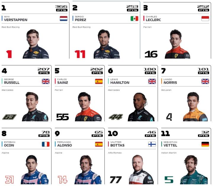 最终,维斯塔潘夺得本站赛事的冠军,成功卫冕年度车手总冠军!佩雷兹排名第二,勒克莱尔被罚时5秒排名第三。博塔斯和周冠宇排在第15和第16位。值得一提的是,拉提菲获得了本赛季的首个积分。