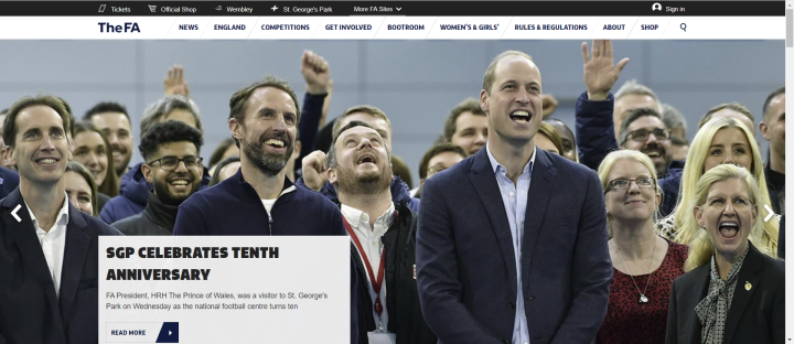进入英足总的官网,第一条新闻就是英足总名誉主席威尔士亲王威廉与英足总首席执行官马克·布林汉姆和英格兰代表队的主教练加雷斯·索斯盖特前往英格兰队的常驻点之一圣乔治公园同工作人员庆祝英格兰的主场建成10周年的纪念日,并观看了英格兰男子高级聋人足球队和英格兰男子电动轮椅足球队的训练课程。在这之后,威尔士亲王还会见了来自社区俱乐部的孩子们。