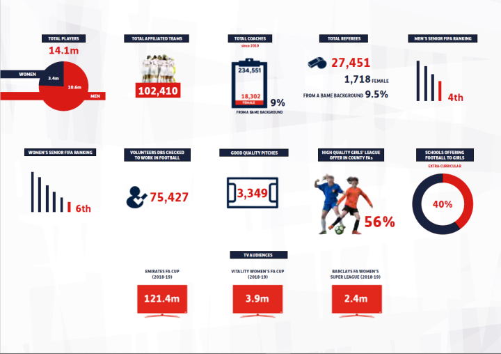 在报告中,英足总对全英格兰境内的注册球员、球会、教练、裁判和校园足球等重要指标做出了统计:目前,英格兰境内共有约1410万注册球员,包括1060万男子足球运动员和340万女子足球运动员,占英格兰总人口的约五分之一。