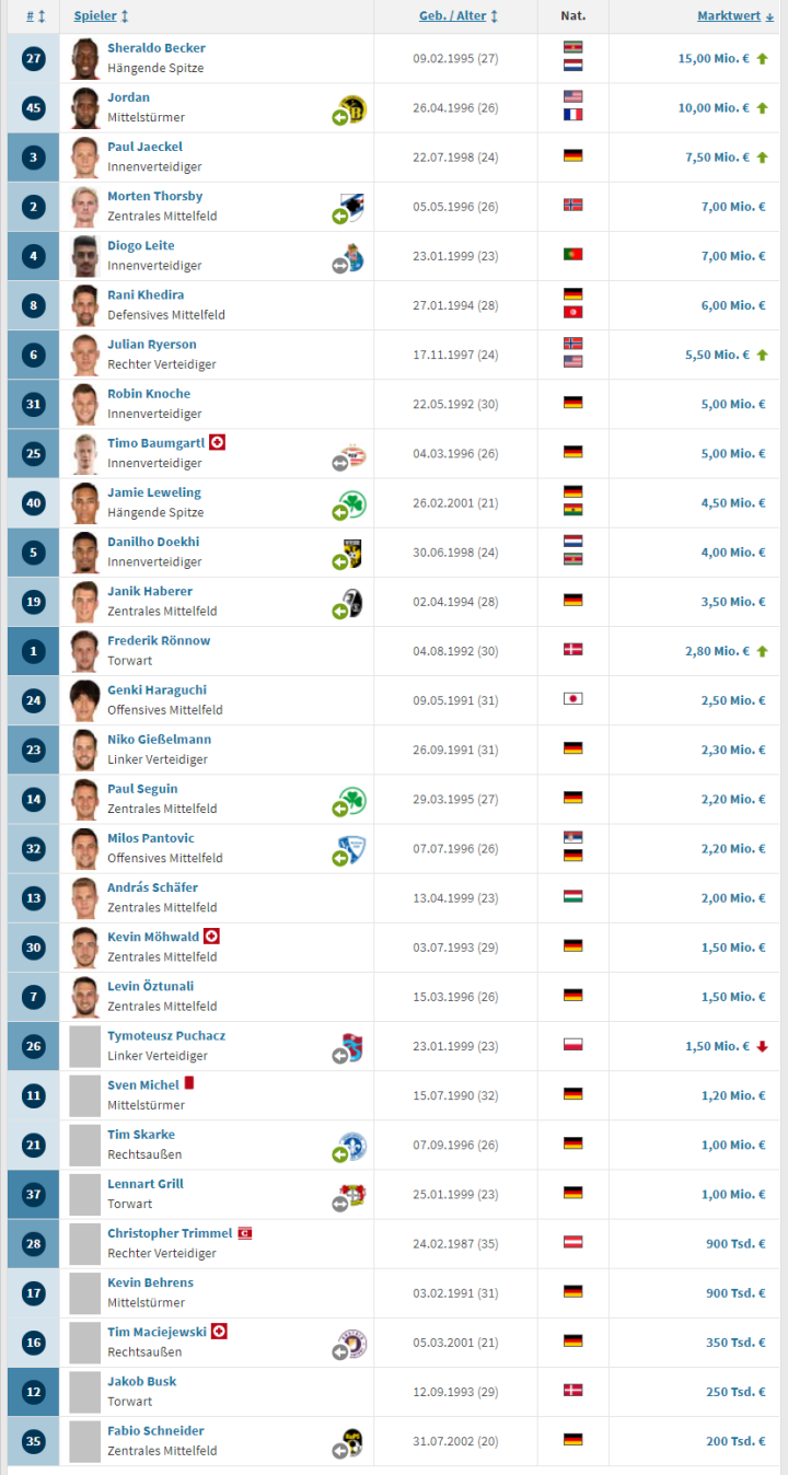 目前队内身价最高的球员是身价1800万欧元的苏里南前锋贝克尔,现年27岁的贝克尔本赛季已经为球队打进7个进球并送出3次助攻,成为了球队的头号射手。队内也只有贝克尔和美国前锋塞巴切乌的身价超过了1000万欧元。