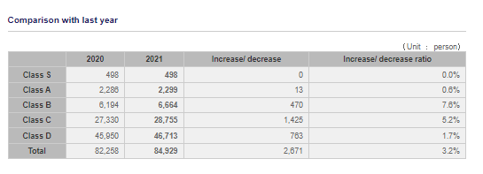 目前,日本共有足球教练84929名,其中S级教练498名,A级教练2299名,B级教练6664名,C级教练28755名,D级教练46713名。
