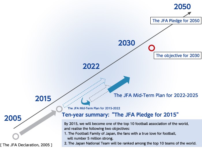 1. “日本足协2005宣言”——百年梦想:2015年要成为世界前10的足协,足球人口500万人(球员及其家庭、足球工作者、注册的球迷),球队进入世界前十;2050年足球人口1000万,占日本总人口10%,再举办一次世界杯并获得冠军;