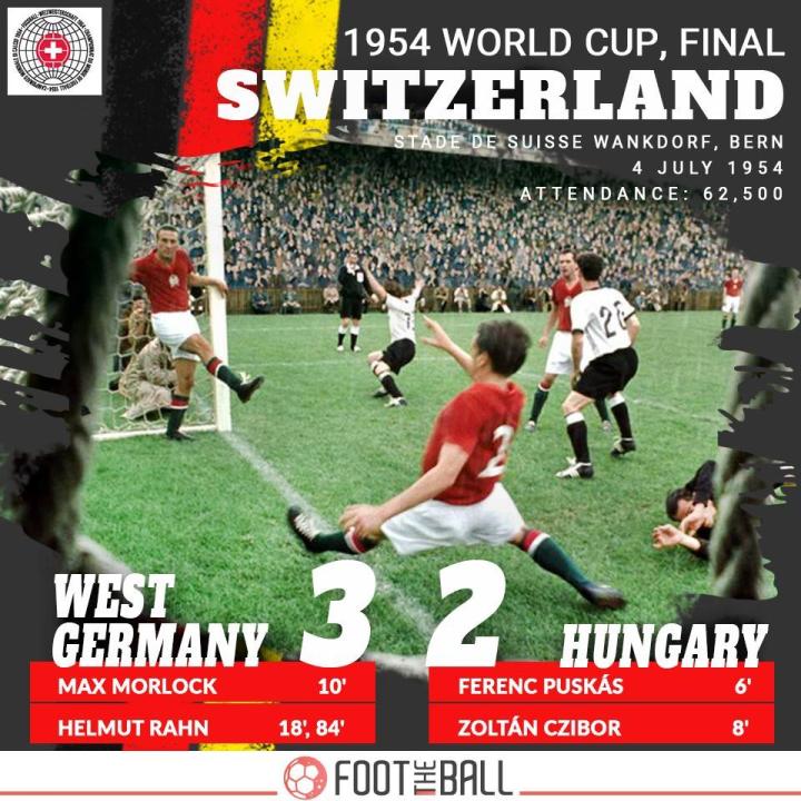 1954年7月4日,决赛在伯尔尼进行。匈牙利的普斯卡什带伤上场,德国队相比小组赛,则派出了更多主力。本场比赛在风和日丽中开场,普斯卡什6分钟闪电战破门,2分钟后,齐博尔扩大了领先优势。几乎所有球迷都认为,比赛结束了。