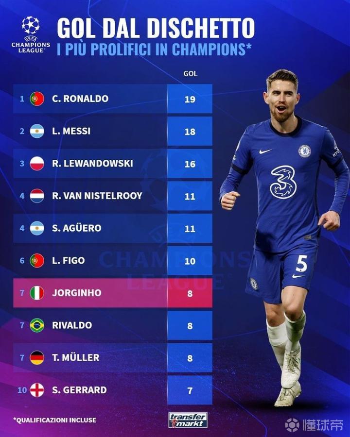 德国转会市场网站列出了欧冠改制后点球进球排行榜,C罗19球居首,梅西18球第二,若日尼奥8球列第七。