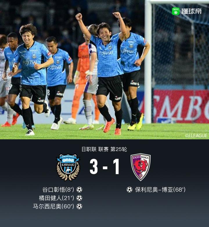 川崎前锋主场3-1京都不死鸟,距榜首2分,马尔西尼奥建功