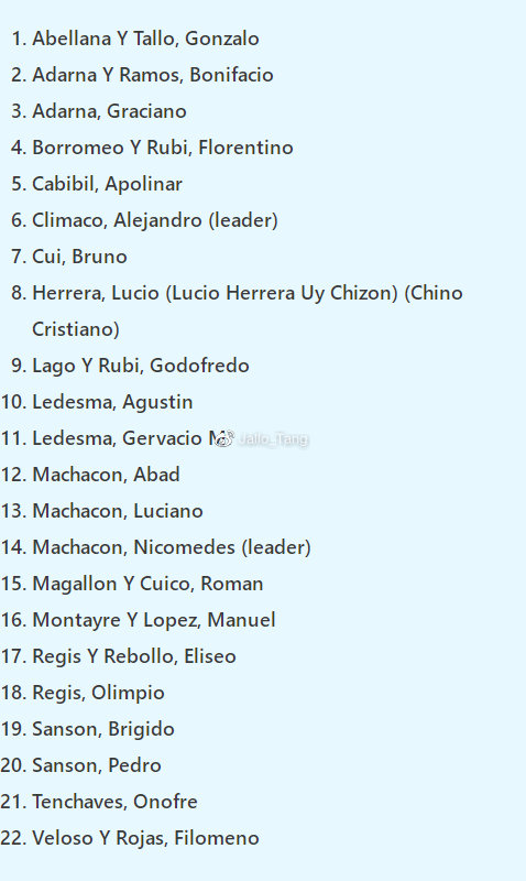 这个人就是编号7的Bruno Cui。关于Bruno我们知之甚少,只知道他出自Cui这个华裔家族,而Cui家则是宿务当地最古老的几个华裔麦仕蒂索家族之一时间可能早于17世纪,按照《妈祖的子民——闽台海洋文化研究》一书描述,早期菲律宾华人主要以海澄县和晋江安平镇为主,因此Cui家祖籍地极有可能是二地之一。另外,Cui是按照西班牙语拼写,发音与英语的Kwee十分相似,因此可能是闽南语的郭。