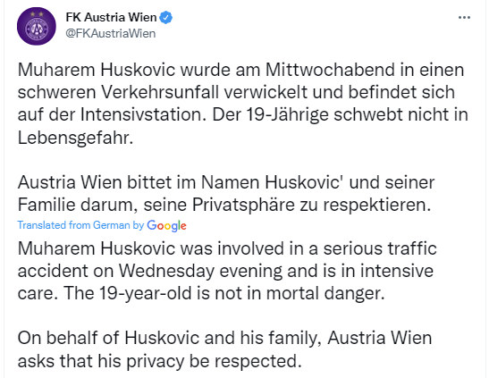奥地利维也纳官方在社交媒体上发布公告:“哈雷姆-胡斯科维奇在本周三晚遭遇了一场严重的交通事故,目前仍在重症监护室,不过这名19岁的孩子已无生命危险。奥地利维也纳俱乐部代表胡斯科维奇及其家人,要求各方尊重其个人隐私情况。”