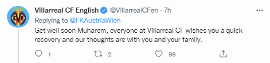 当地时间本周四,比利亚雷亚尔将前往客场挑战奥地利维也纳。比利亚雷亚尔俱乐部的官方英文社交媒体转发并评论道:“祝愿穆哈雷姆早日康复,比利亚雷亚尔的每个人都祝愿你尽快痊愈,我们的挂念与你和你的家人同在。”