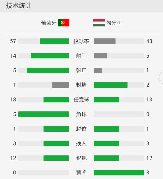 全场比赛结束,葡萄牙主场3-0战胜匈牙利。