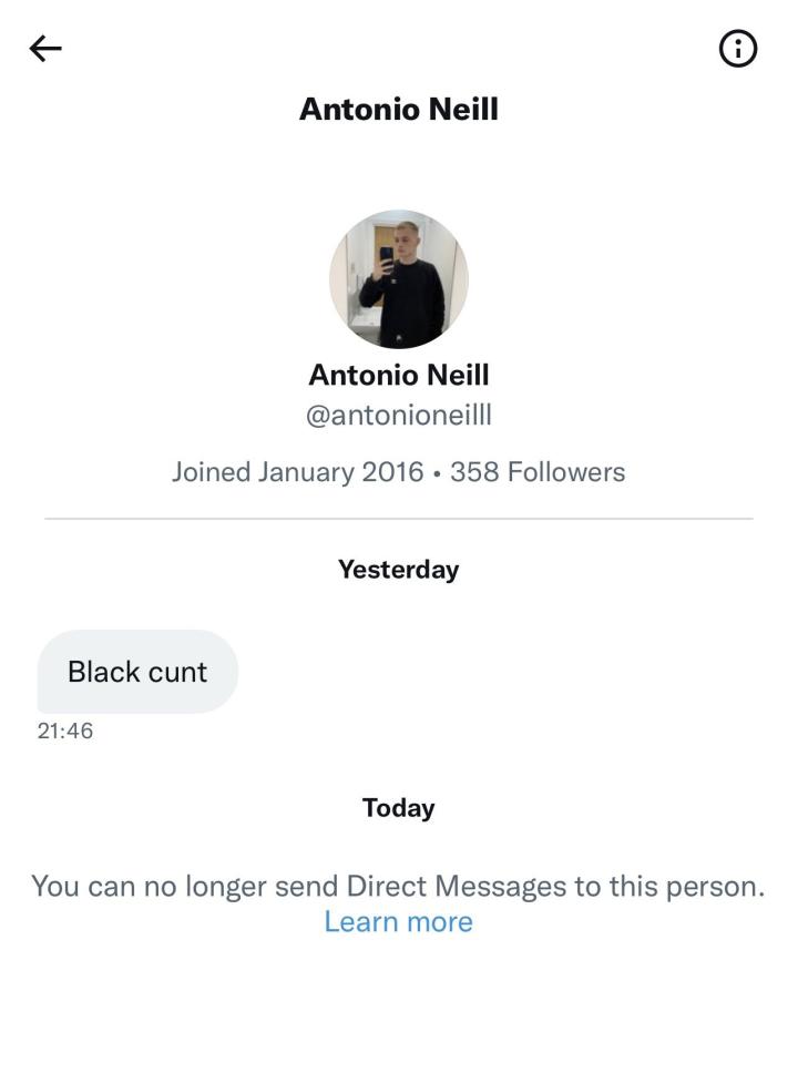 正如托尼所说,这次他遭遇的言语歧视就是来自社交媒体的私信,这也是他愤怒的原因。