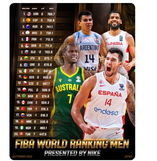 FIBA国际篮联最新男篮世界排名美国高居榜首!