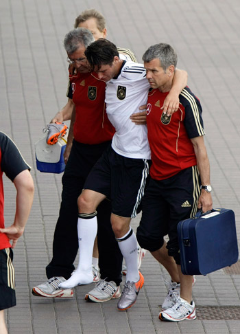 说到2010年世界杯,最可惜的当属队长巴拉克。在当年5月15日的英格兰足总杯决赛中,朴茨茅斯的大博阿滕在第35分钟时铲球伤巴拉克。虽然赛后在温布利球场的X光检查并未发现断骨,但是巴拉克周一在德国进一步进行扫描诊断后发现,他的右脚脚踝韧带局部拉伤,预计需要八周时间才能恢复训练。而德国队在南非的首场比赛将于6月13日打响,对手是澳大利亚队。因为突出起来的冲击,巴拉克不得不以球员的身份告别南非世界杯。