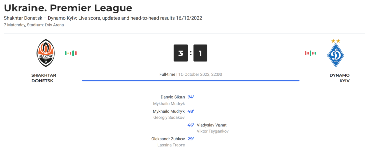 这是乌克超被迫停赛后,首场乌克兰国家德比战。上半场,祖布科夫凌空抽射建功,顿矿取得领先。下半场,齐甘科夫助攻瓦特纳,帮助基辅迪纳摩扳平比分。随后穆德里克禁区外低射破门,让门将内施切雷特没有做出任何反应。第69分钟,扎巴尔尼被出示红牌,基辅只能10人应战。第74分钟,穆德里克在反击中助攻西坎推射空门,扩大比分优势。最终,顿涅茨克矿工3:1击败基辅迪纳摩,取得德比战的胜利。